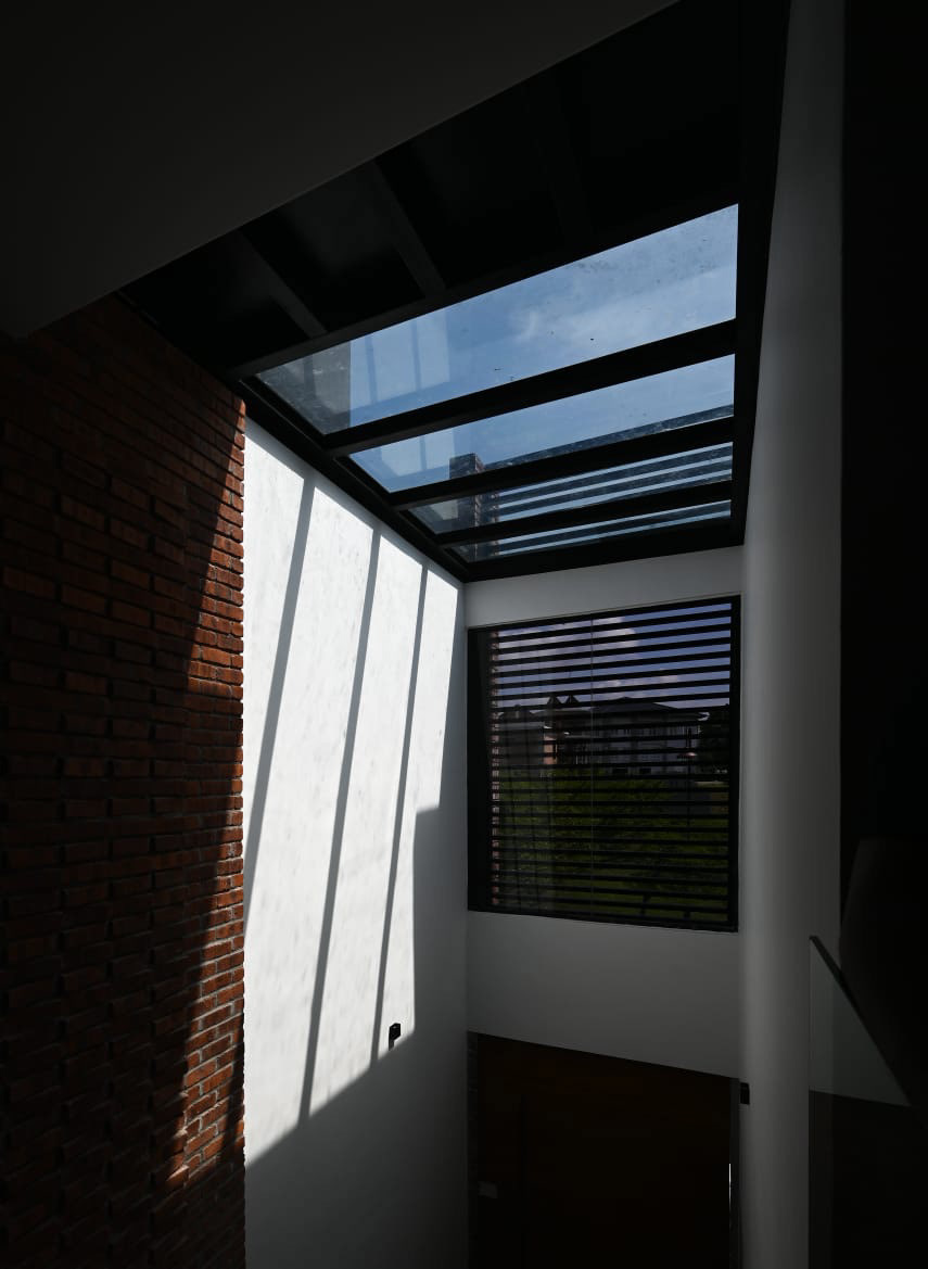 We try to incorporate unwashed clay bricks and concrete finishes as its counterpart to accentuate the contrasting element while keeping the new-old, refined-rough in equilibrium. Manipulating further into the interior of the house, we break the spaces in such a way that revolves around the triple-volume inner atrium, concocting continuous visibility from each floor. One of the main features of the house such as the clay bricks deliberately intrudes the internal atrium, adorning the Foyer Hall as a Feature Wall while welcoming natural lighting, washes off from the skylight opening above.