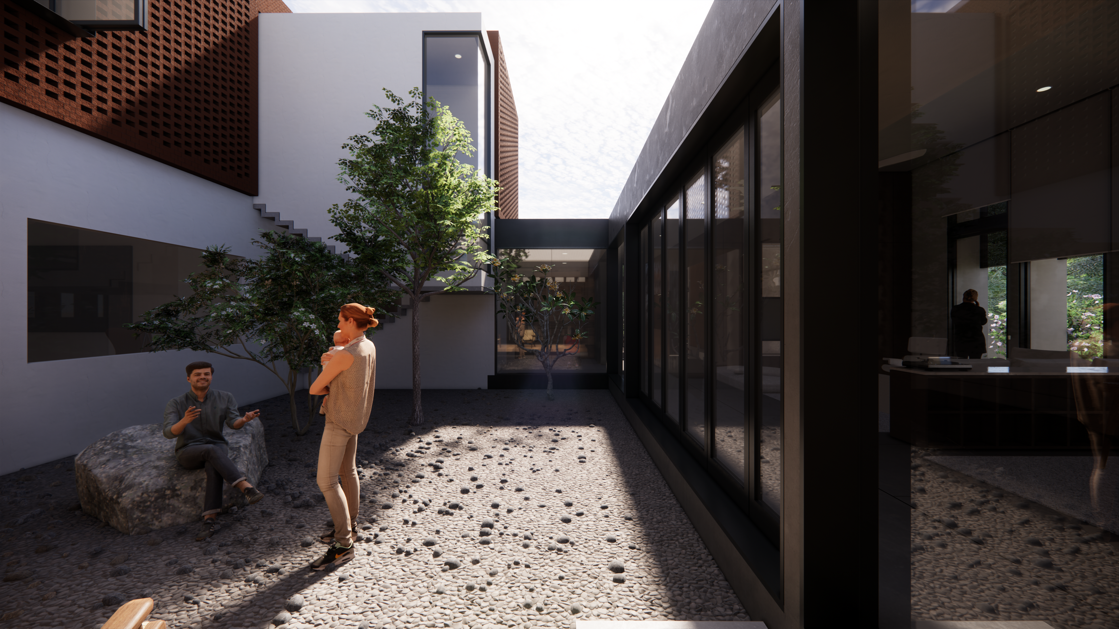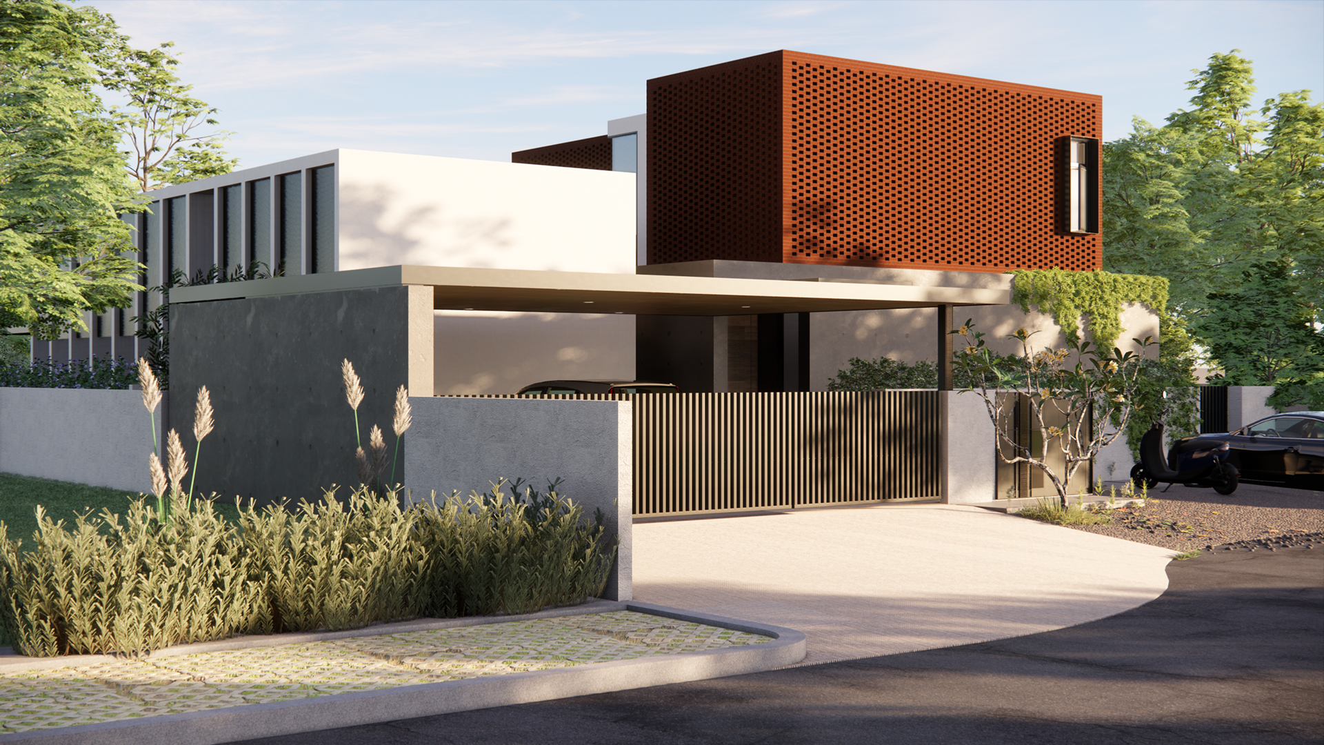 By having this notion as a design trajectory and body of work, we foresee a hybridised-new house typology can be instigated and developed further. Thus, we interpret the house in a muted frontage, emphasising the primitive blocks and geometries that are erected vertically, hoping it would justify the synchronicity of the overall building masses. Throughout the facilitation of the internal spaces, we configure two wings that segregate both the public wing (Guest Room, Formal Living Hall, Formal Dining Hall) and private wing, (Surau, Offices and Workspaces, Primary Suite) connected by a semi-public threshold (Dry Kitchen, Family Area). This spatial coordination set up a parameter in terms of distinguishing circulation and spatial proximity of the house